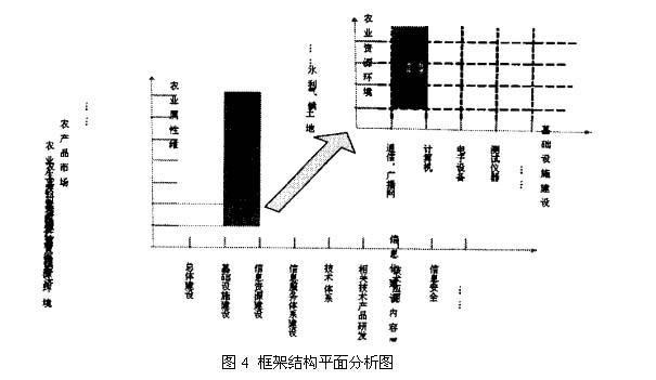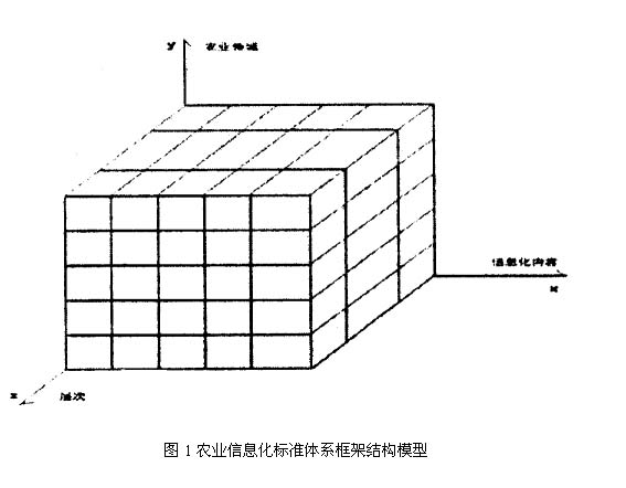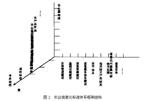一般的体系框架采用较为简洁的二维结构,但它只能表达出标准二维要素的联系,而标准具有对象、内容和级别三要素,当标准要素错综交汇的时候,二维结构就不能准确地表达出每一个标准在框架中的定位,且相互间易发生干扰,因此整个框架中标准的容量就比较小。本体系框架根据印度魏尔曼最早提出的标准体系表三维结构的思想,再结合标准化三维空间的概念(标准化三维空间将标准等级的提高、领域的扩大和内容的不断充实看作是一个发展的过程)。在广泛比较的基础上,采用了农业领域(对象)、信息化内容(内容)和标准层次(级别)的三维结构,在每一维结构中又增加小门类,延伸了结构的空间,大大地扩展了标准的存贮容量,为标准体系的未来发展准备了广阔的空间,结构上体现了框架的先进性和科学性。