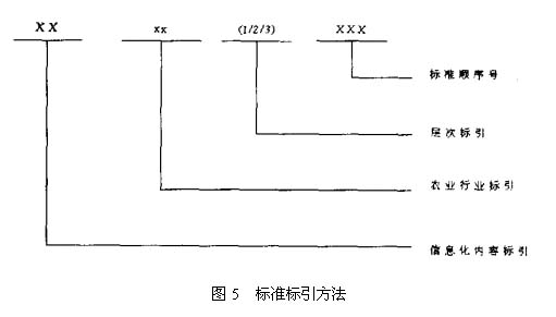 基于农业信息化标准体系框架是三维空间的考虑,标准标引方法决定采用复合码,由三维坐标的位置+标准顺序码组成。具体标引方法是,标准体系表标引号由分类号和标准顺序号组成。分类号表明标准在框架中的位置,由农业属性编码、信息化内容属性编码和层次属性编码组成,采用英文字母与阿拉伯数字混合编号形式,即标准的信息化内容编码以二位大写正体英文字母表示,农业属性编码以二位小写正体英文字母表示,层次编码以一位阿拉伯数字表示。标准顺序号以三位阿拉伯数字表示,分标准不赋予单独的标准体系表标引号。标准体系表标引号书写方式如下(图5)。