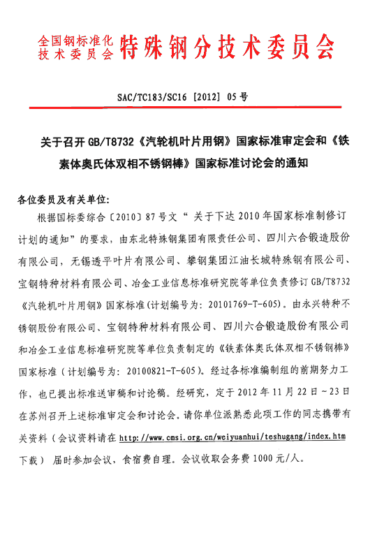 关于召开《汽轮机叶片用钢》等国家标准审定会的通知