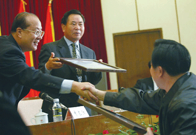 卫留成(中)、李长江(左)向文昌市人民政府、海南省盐业进出口公司颁发原产地标记注册证书