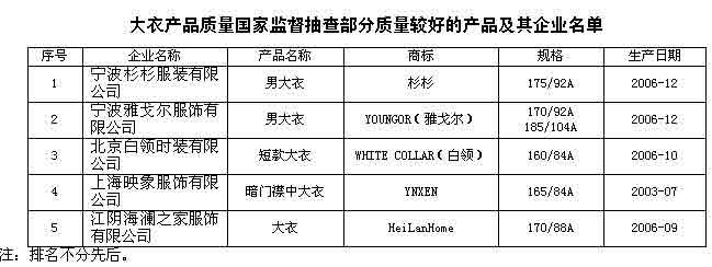 抽查结果表明,一是抽查涉及人身健康安全的甲醛含量、pH值及产品标识三项指标均符合标准要求。二是抽查的11种男式大衣产品质量全部合格。三是与2006年抽查的大衣产品相比产品抽样合格率提高了11个百分点。