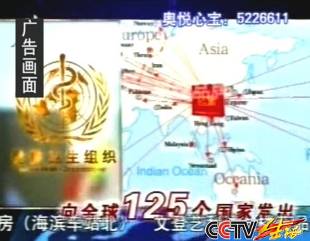 广告:“联合国世界卫生组织正式向全球125个国家发出推广奥悦心宝的紧急通知,全球推广奥悦心宝”;