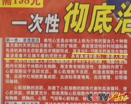 记者专门咨询了有关专家后了解到,其实,这个波长范围内的光波属于远红外线。也许是认为远红外线这个词太不新鲜了吧,奥悦心宝的宣传中,推出了“摸不着看不见的高效生物能量波”的说法,说它具有高度穿透力,渗透人体深部,激活衰老细胞,然后为细胞补充能量,再后是养护心脏,最终就一次性彻底治愈心脏病。