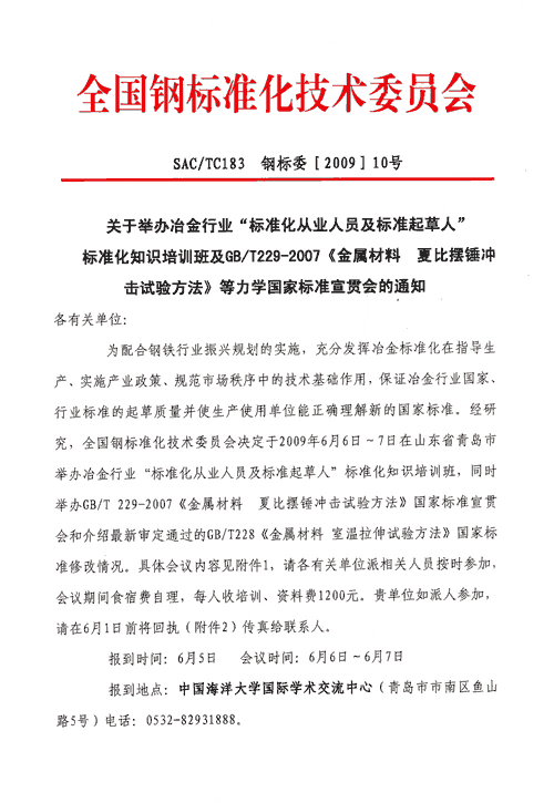 举办冶金行业标准化知识培训班及《金属材料夏比摆锤冲击试验方法》等国家标准宣贯会的通知